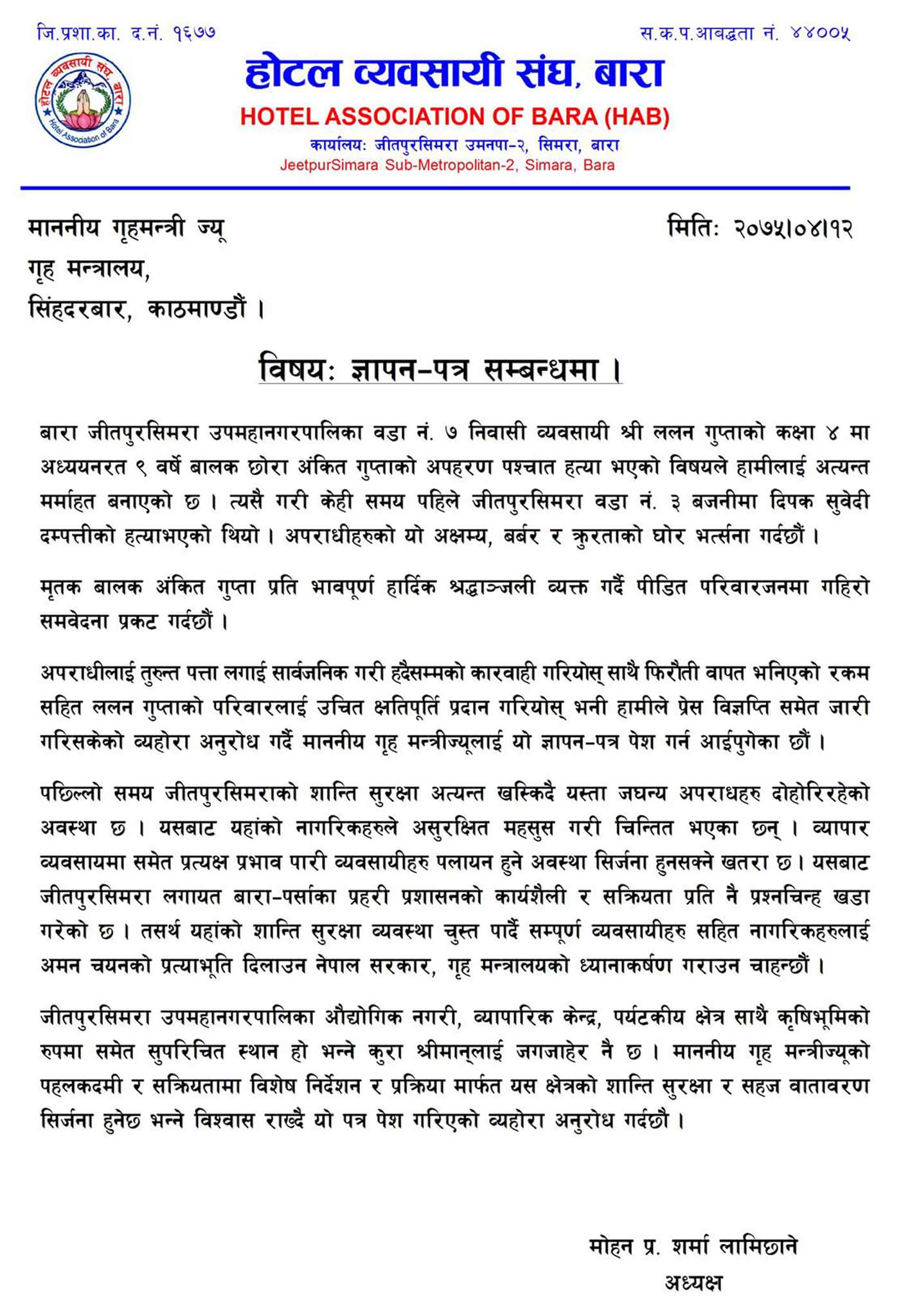 बाराका सरोकारवालाहरुले अंकितकुमार साहका हत्यारालाई कडा कारर्वाही गर्न सरकारसंग माग गरेका छन् । प्रहरी प्रशासनको उदासिन्ताका कारण अंकितको अपहरणपछि हत्या भएको भन्दै सरोकारवालाहरुले आज गृहमन्त्री रामबहादुर थापा बादलको ध्यानाकर्षण गराएका छन् ।