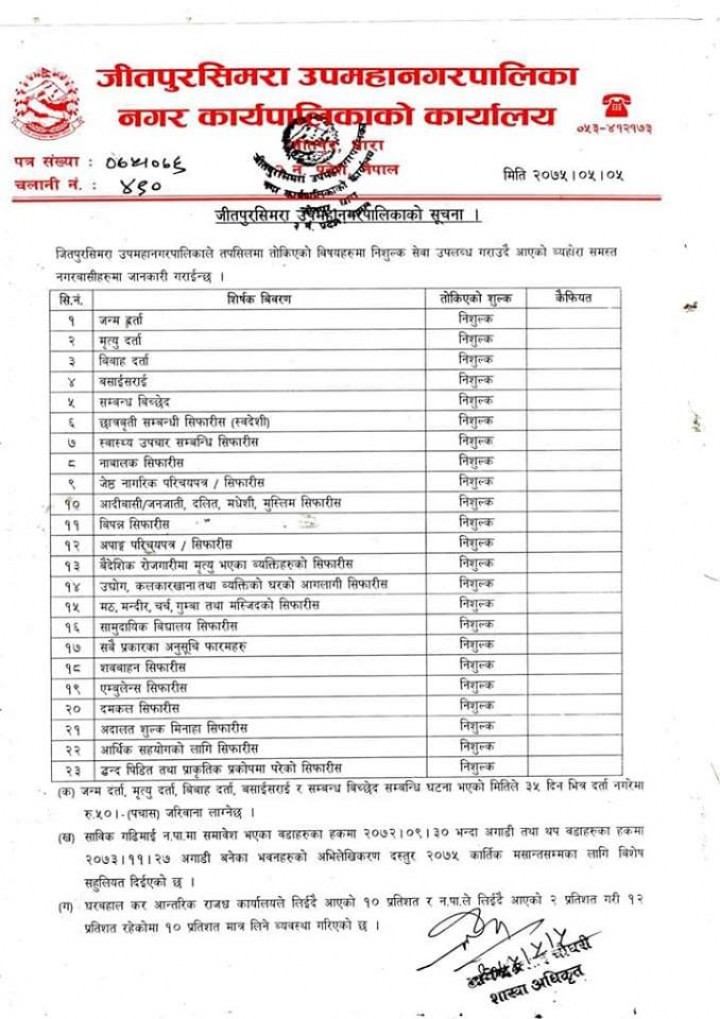 २३ प्रकारका सिफारिश निशुल्क गर्ने निर्णय गर्दे जीतपुरसिमरा उप–महानगपालिकाले आज सार्वजनीक सुचना जारी गरेको थियो । जसअनुसार जन्मदर्ता, मृत्यु दर्ता, विवाह दर्ता, बसाई सराई, सम्बन्ध विच्छेद, स्वदेशी अध्ययनका लागि छात्रबृती सिफारिस, स्वास्थ्य उपचार सम्बनिध सिफारिस, नावालक सिफारिस, जेष्ठ नागरिक परिचयपत्र सिफारिस, आदिवासी जनजातीरमधेशीरमुस्लिमरदलित सिफारिस, द्वन्द पिडित तथा प्राकृतिक प्रकोप, मठ मन्दिर, चर्च, गुम्बा, मस्जिदको सिफारि पनि निशुल्क उपलव्ध हुनेछ भने शववाहन,