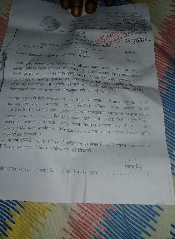अस्थाई ईजलास विरगञ्जले जीतपुरसिमरा उप–महानगरपालिका वडा नम्बर १९ मा प्रयोग भएका सम्पुर्ण कागजातहरु झिकाउन जिल्ला निर्वाचन कार्यालय बारालाई आदेश दिएको छ । वडा अध्यक्ष सुदनदास तत्मा र जिल्ला निर्वाचन कार्यालयलाई बिपक्षी बनाई माओवादी केन्द्रको तर्फबाट उम्मेदवार बनेका दिपेन्द्र कुमार क्षेत्रीले हालेको रिट उपर आदेश दिदै अदालतले निर्वाचन कार्यालयलाई निर्वाचनको समयमा प्रयोग भएका मतपत्रसहित सबै काजगातहरु झिकाउन भनेको हो । हेर्नुहोस् पत्रमा अदालतको आदेश