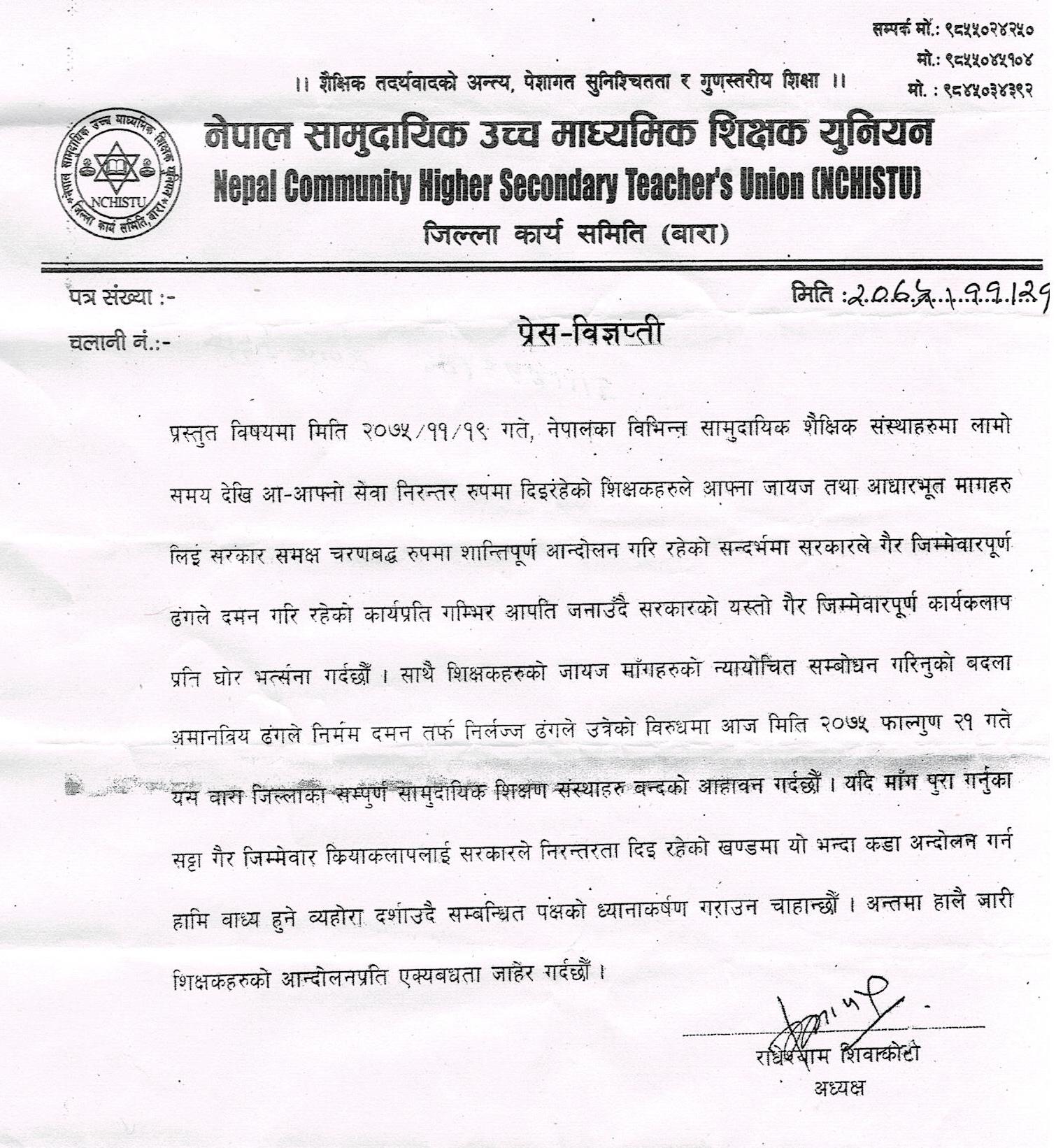 नेपाल सामुदायिक उच्च माद्ययमिक शिक्षक युनियन जिल्ला कार्य समिति बाराले आन्दोलनरत्त शिक्षकहरुको माग तत्काल सम्बोधन गर्न सरकारसंग माग गरेको छ । आज एक प्रेस बिज्ञप्ती जारी गर्दे जिल्ला कार्य समिति बाराले शिक्षकहरुको आन्दोलनप्रति एक्यवद्धता जनाउदै जायज माग सम्बोधन गर्न सरकारसंग माग गरेको हो ।