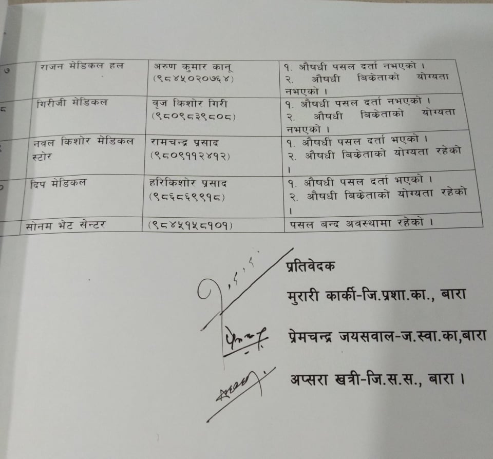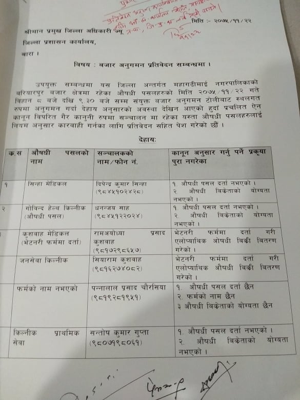 जिल्ला प्रशासन कार्यालय बाराका प्रशासकिय अधिकृत मुरारी कार्कीको नेतृत्वमा खटिएको ३ सदस्यिय टोलिले बरियारपुर क्षेत्रमा नियम बिपरित औषधी पसल सञ्चालनमा रहेको प्रतिवेदन आज बाराका प्रमुख जिल्ला अधिकारीलाई बुझाएका छन् । प्रतिवेदन बुझ्दै बाराका प्रमुख जिल्ला अधिकारी राजेश पौडेलले अबैधानीक रुपमा सञ्चालनमा रहेका औषधी पसलहरु तत्काल नसच्चिए कारवार्ही प्रक्रिया अघि बढाउन कार्की नेतृत्वको टोलिलाई निर्देशन दिनुभएको छ ।