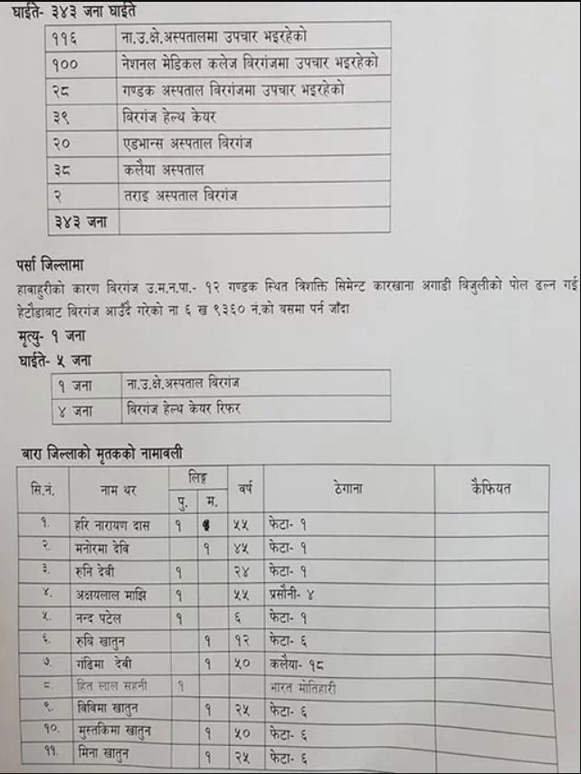 त्यस्तै बारा र पर्साका ७ वटा सरकारी तथा निजी स्वास्थ्य संस्थामा घाइतेहरुको उपचार भइरहेको पनि मन्त्रालयले जानकारी दिएको छ । वीरगञ्जको नारायणी उपक्षेत्रीय अस्पतालमा ११६, नेशनल मेडिकल कलेज वीरगञ्जमा १००, गण्डक अस्पताल वीरगञ्जमा २८, वीरगञ्ज हेल्थकेयरमा ३९, एड्भान्स अस्पताल वीरगञ्जमा २०, कलैया अस्पतालमा ३८ र तराई अस्पताल वीरगञ्जमा २ जना गरी ३४३ जनाको उपचार भइरहेको मन्त्रालयले जनाएको छ ।
