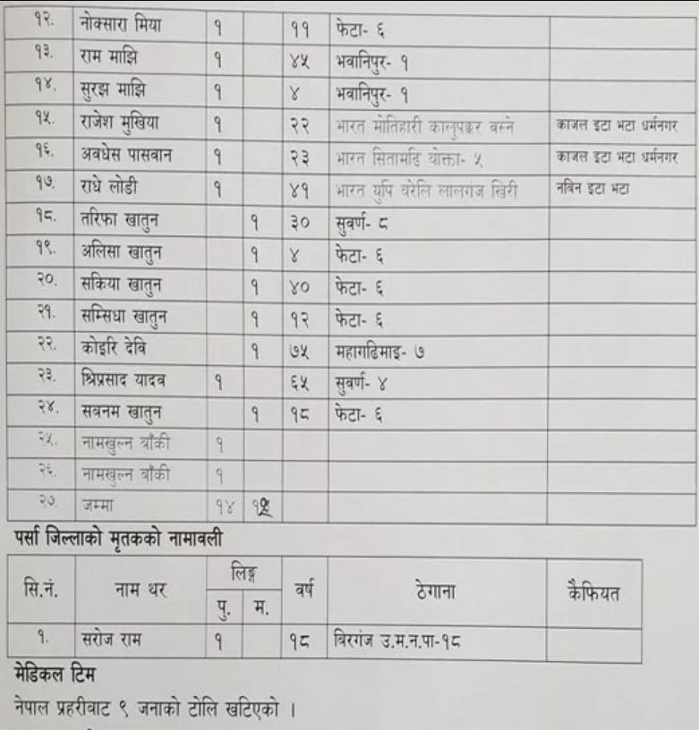 बारा र पर्सामा आइतबार राति आएको भीषण हावाहुरीका कारण ज्यान गुमाएका २७ जनामध्ये २५ जनाको सनाखत भएको छ । गृहमन्त्रालयले पत्रकार सम्मेलन गरी ज्यान गुमाएकाको सूची सार्वजनिक गरेको हो ।