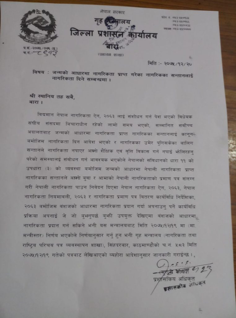 जिल्लाका १६ वटै स्थानीय तहलाई पत्राचार गर्दे प्रशासन कार्यालयले प्रक्रिया पुरा गरेर मात्रै नागरिक्ता दिन भनेको छ । जिल्ला प्रशासन कार्यालय बाराका प्रशासकीय अधिकृत मुरारी कार्कीद्धारा जारी पत्रमा भनिएको छ ‘नागरिकता ऐन २०६३, नेपाल नागरिकता नियमवली २०६३, नागरिकता प्रमाणपत्र वितरण कार्यविधि २०६३ बमोजिम वंशको आधारमा नागरिकता प्रदान गर्दा अपनाउनु पर्ने कार्यविधि प्रक्रिया अपनाई जे जे बुझ्नुपर्छ बुझी उपयुक्त देखिएमा वंशजको आधारमा नागरिकता प्रदान गर्न सकिने २०७५ चैत १९ गतेको मन्त्रीस्तरिय निर्णय भएकाले निर्णयानुसार गर्नुहुन अनुरोध गरिन्छ’ ।