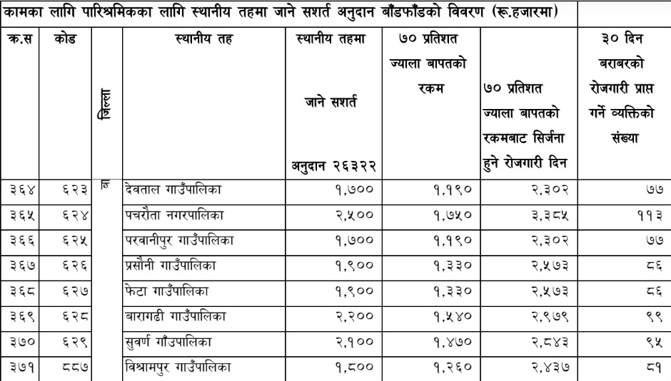 सबैभन्दा बढीले रोजगारी पाउने स्थानीय तहमा भीमदत्त नगरपालिकामा (४५१ जनालाई), सुर्खेतको वीरेन्द्रनगर नगरपालिका, रूपन्देहीको बुटवल उपमहानगरपालिका, चितवनको भरतपुर महानगरपालिका, पर्साको वीरगन्ज महानगरपालिका, मकवानपुरको हेटौँडा उपमहानगरपालिका, ललितपुरको लतिलपुर महानगरपालिका, काठमाडौँ महानगरपालिका, धनुषाको जनकपुर उपमहानगरपालिका, मोरङको विराटनगर महानगरपालिकामा ४५१ जनाले ३० दिन बराबरको रोजगारी पाउँनेछन् ।