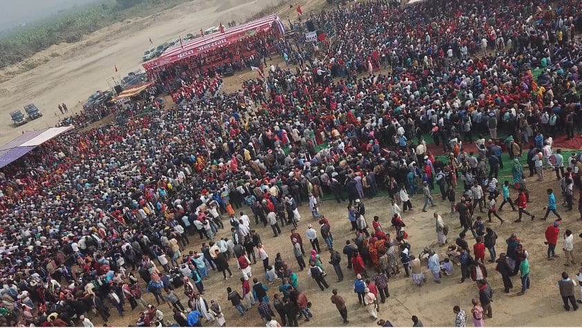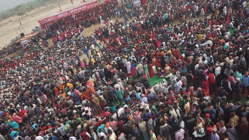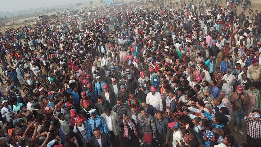 बाराको निजगढमा नेपाल कम्युनिष्ट पार्टी नेकपा प्रदेश नम्बर २ ले आयोजना गरेको बृहत जनसभामा अध्यक्ष प्रचण्ड आउदा देखिएको दृश्य ।