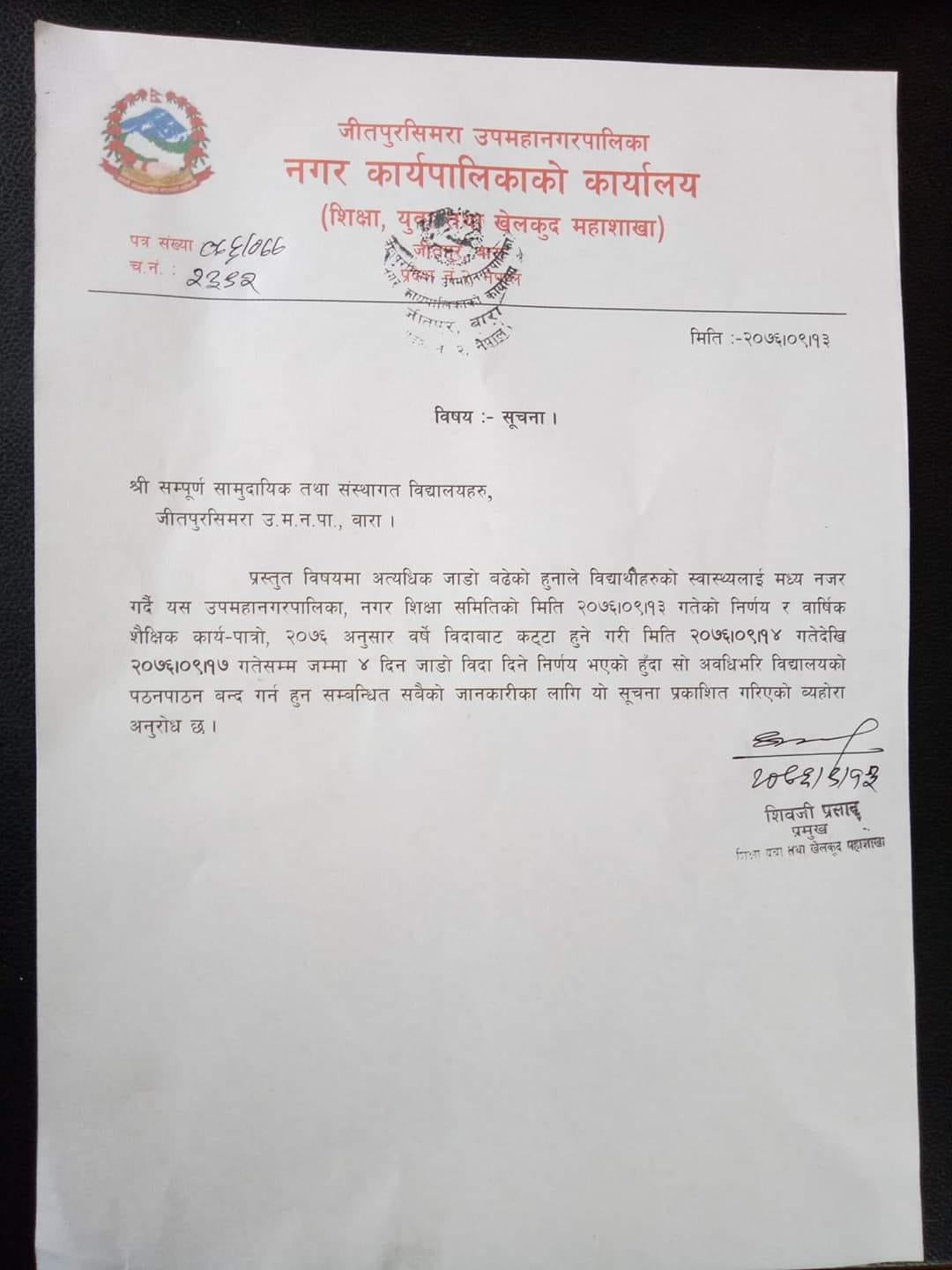 जीतपुरसिमरा उपमहानगरपालिकाभित्रका सम्पुर्ण सामुदायिक तथा संस्थागत बिद्यालयहरु ४ दिनका लागी बन्द हुने भएको छ । पछिल्लो समय अत्याधिक जाडो बढेपछि उपमहानगरपालिकाको नगर शिक्षा समितिले ४ दिनका लागी बिद्यालय बन्द गर्ने निर्णय गरेको हो ।