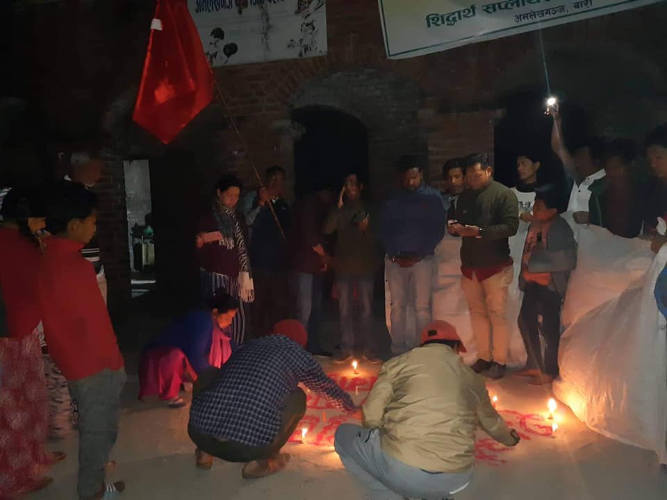 नेपाल कम्युनिष्ट पार्टी नेकपाले बाराको अमलेखगञ्ज आज जनयुद्ध दिवस मनाएको छ । नेकपा वडा नम्बर २१ को वडा कमिटिले आज दिवसको अवसरमा दिप प्रज्वलन कार्यक्रम गरेको हो । दिप प्रज्वलन कार्यक्रममा अमलेखगञ्जका स्थानीय नेता कार्यकर्ताको उपस्थिति रहेको थियो ।