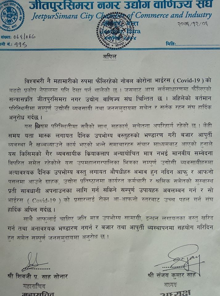 जीतपुरसिमरा उद्योग वाणिज्यको अपिल : ‘कोरोनाबाट सचेत र सर्तक रहौ’