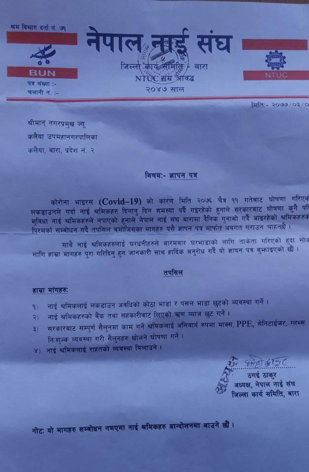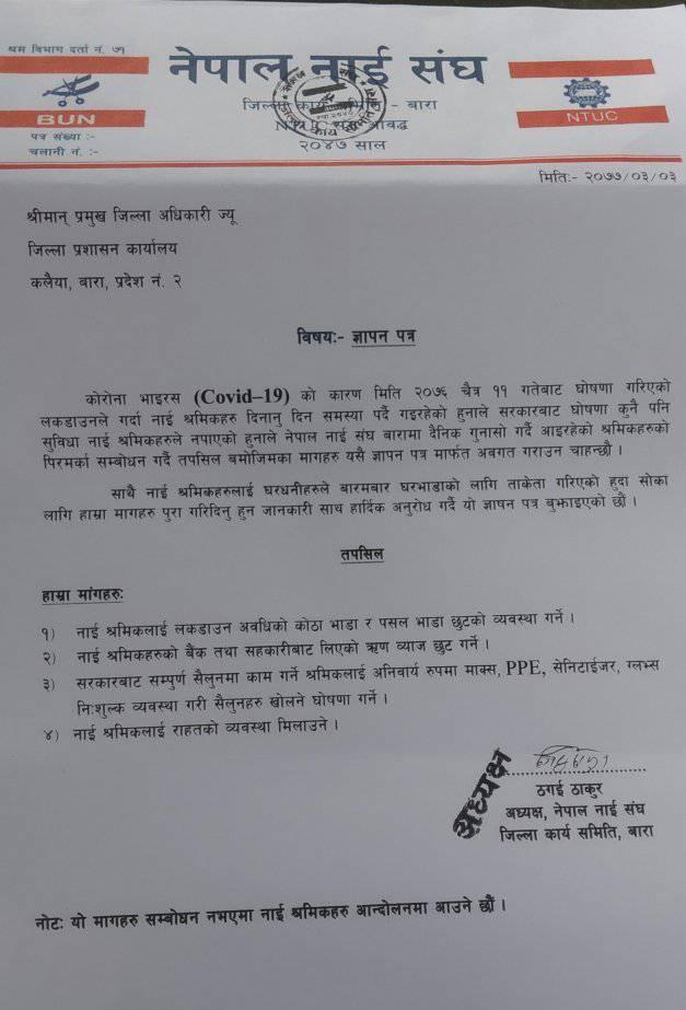 बिभिन्न ४ सुत्रीय माग राख्दै नेपाल नाई संघ जिल्ला कार्य समिति बाराले जिल्ला प्रशासन कार्यालयमा ज्ञापन पत्र बुझाएको छ । लक डाउनका कारण सबै क्षेत्र अस्तव्यस्त भएकोभन्दै सहज वातावरण शिर्जनाको निम्ति नाई संघले ज्ञापन पत्र बुझाएको हो ।