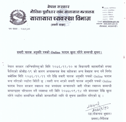 विभागकाअनुसार कोरोना भाइरसविरुद्ध स्वास्थ्य मन्त्रालयले तयार पारेको मापदण्ड पालना गर्ने गरी नयाँ लाइसेन्सको परीक्षा र वर्ग थपको प्रक्रिया खुला गर्न लागिएको हो ।