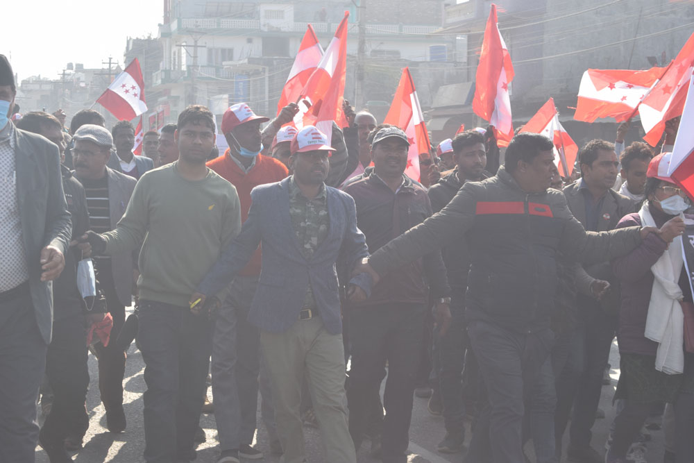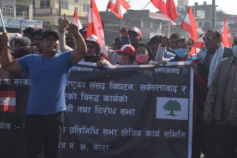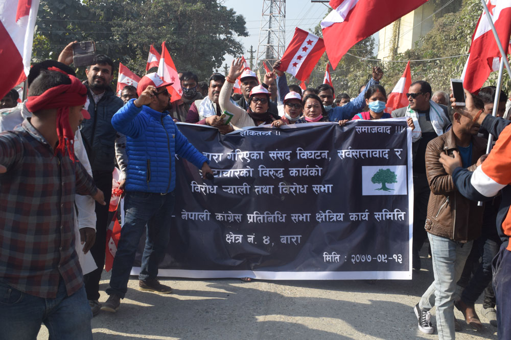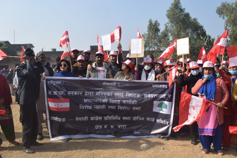 संसद विघटन विरुद्ध देशव्यापी आन्दोलनका कार्यक्रम घोषणा गरेको नेपाली काग्रेसले आज बाराको सिमरामा बिरोध कार्यक्रमको आयोजना गरेको छ । प्रधानमन्त्री केपी शर्मा ओलीले गत पुष ५ गते असंवैधानिक ढंगले संसद विघटन गरेको बिरोधमा काग्रेसले आज सिमरामा बिरोध कार्यक्रमको आयोजना गरेको हो ।