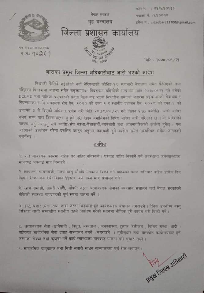 डिसिसिएमसि र पालिका प्रमुखहरुको बैठकले गरेको सिफारिसको आधारमा जिल्ला प्रशासन कार्यालय बाराले बनाएको नया नियम २३ गते बिहान ६ बजेदेखि लागुहुने प्रमुख जिल्ला अधिकारी सुरेन्द्र पौडेलले जानकारी दिनुभयो । अर्को आदेश नभएसम्मका लागी लागु गरिएको नियम पालना नगरे कानुन अनुसार कारर्वाही गरिने उहाले बताउनुभयो ।
