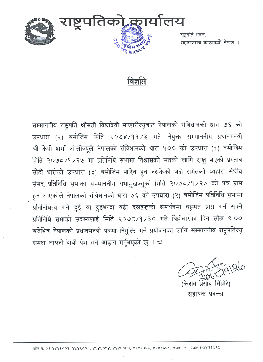 राष्ट्रपति विद्यादेवी भण्डारीले बहुमतको सरकार गठन गर्न दलहरुलाई आहृवान गरेकी छन् । प्रधानमन्त्री केपी शर्मा ओली पदमुक्त भएपछि राष्ट्रपतिले संविधानको धारा ७६ (२) अनुसार संसदमा प्रतिनिधित्व गर्ने दुई वा दुईभन्दा बढी दलको समर्थनमा बहुमत प्राप्त गर्न सक्ने संसद सदस्यलाई तीन दिनभित्र दाबी पेश गर्न आहृवान गरेकी हुन् ।