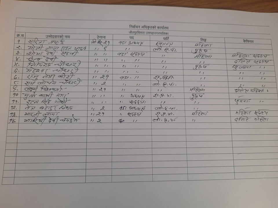 जीतपुरसिमरा उपमहानगरपालिकामा नेपाली कांग्रेस, नेकपा एमाले, नेकपा माओवादी केन्द्र र जनता समाजवादी पार्टीका उम्मेदवारहरुले भोलि मनोनयन दर्ता गराउने छन् ।