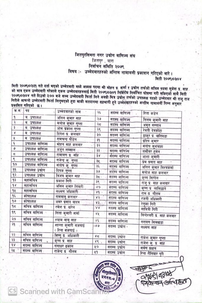 जीतपुरसिमरा : यस्तो छ नगर उद्योग वाणिज्य संघको अन्तिम नामावली