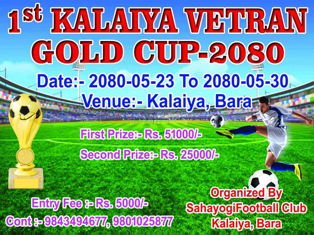 कलैयाको सिद्धेश्वर बिद्यालयमा भदौ २३ गतेदेखि शुरु हुने प्रतियोगिता भदौ ३० गतेसम्म सञ्चालन हुनेछ । प्रतियोगिताको बिजेताले नगद ५१ ह्जार र उप बिजेताले नगद २५ हजार रुपैया पाउने आयोजक क्लबका अध्यक्ष बिनोद कुमार गुप्ताले जानकारी दिनुभयो ।