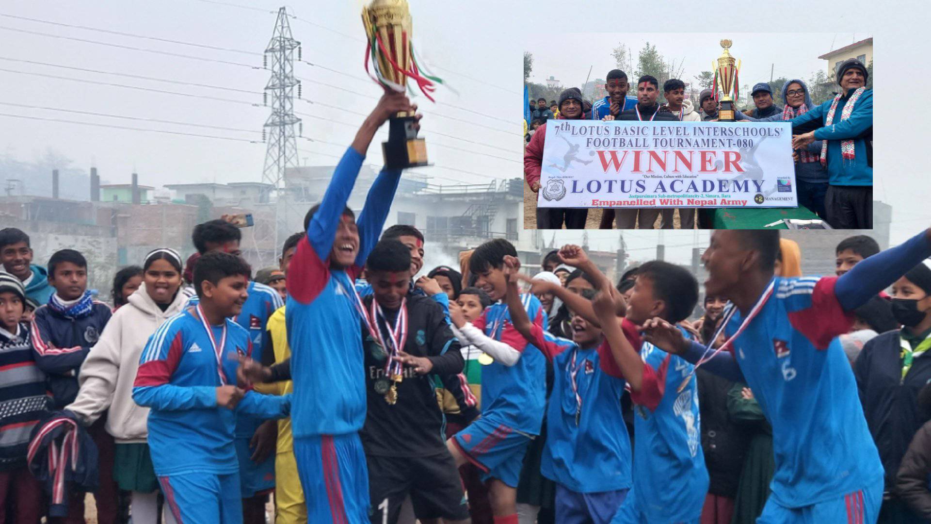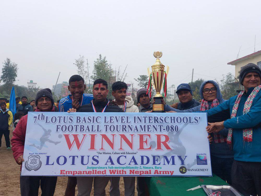 आयोजक लोटस एकेडेमी सिमराले बाराको सिमरामा जारी सातौ लोटस आधारभुत स्तरीय ईन्टरस्कुल फुटबल प्रतियोगिता २०८० को उपाधी उचालेको छ । आज भएको फाईनल खेलमा सिमरा पब्लिक ई. स्कुललाई १-० गोल अन्तरले पराजित गर्दै लोटसले उपाधी उचालेको हो ।