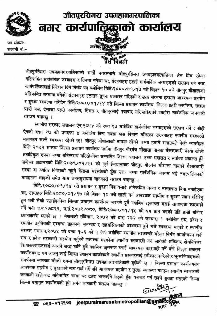 सो मुद्दामा जीतपुर सिमरा उपमहानगरको तर्फबाट अधिवक्ता विद्यादेवी कटुवाल, श्याम विहारी कुश्वाहा र दामोदर पौडेलले बहस गरेका थिए । वैशाख १७ गते सार्वजनिक गौशालाको जग्गामा वीरगन्जका केही जग्गा माफियाले संरचना बनाएर भोग चलन गरेपछि जीतपुर सिमरा उपमहानगरले सो संरचनाहरू हटाएको थियो ।
