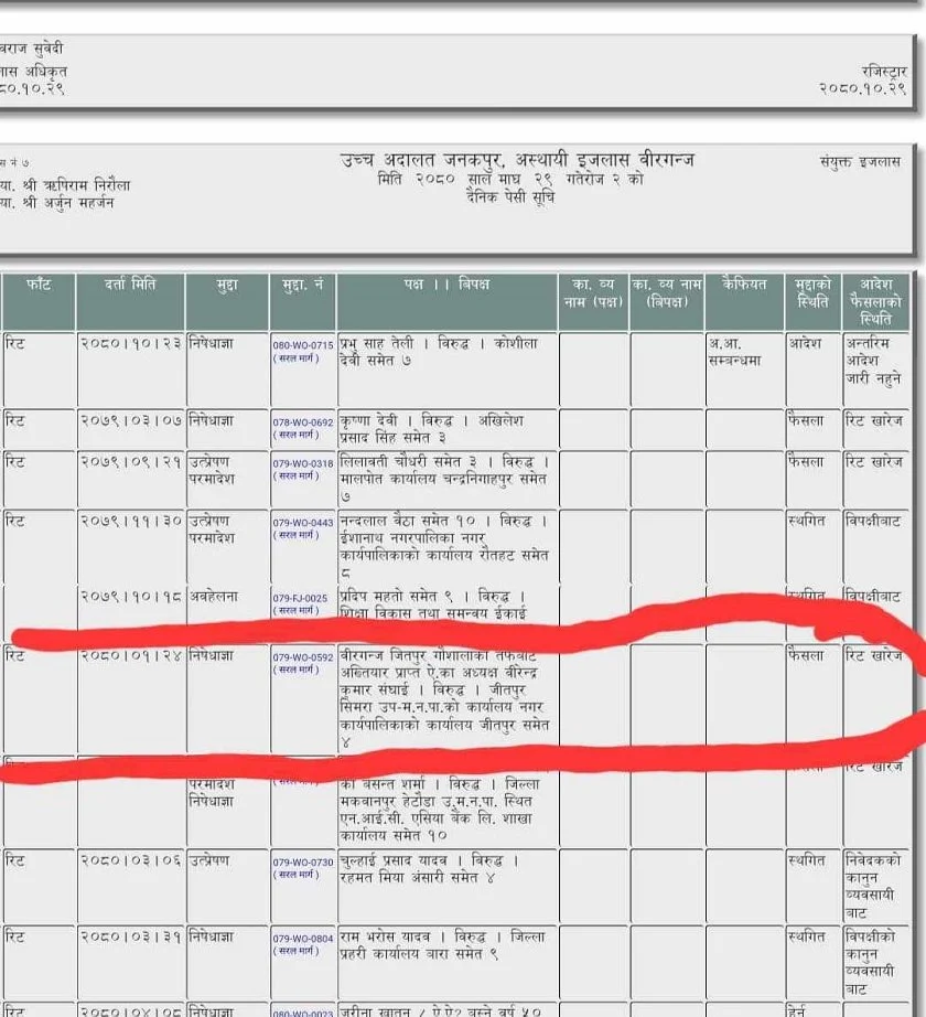 बाराको जीतपुरस्थित सार्वजनिक गौशालाको जग्गा संरक्षणको क्रममा जीतपुर सिमरा उपमहानगरविरुद्ध उच्च अदालत जनकपुर अस्थायी इजलास वीरगन्जमा दायर भएको रिट खारेज भएको छ ।न्यायाधीश दुर्गाबहादुर विश्वकर्मा र हरिप्रसाद जोशीको संयुक्त इजलासले आज सो रिट खारेज गरेको हो ।