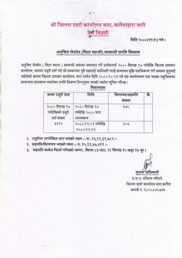 अनुचित लेनदेन ( मिटरब्याज ) सम्बन्धी समस्या समाधान गर्ने प्रयोजनार्थ २०८० वैशाख १७ गतेदेखि जिल्ला प्रशासन कार्यालय, बारामा उजुरी दर्ता गर्न सुरु गरिएको थियो। यस्तै, फागुन ०१ गतेदेखि १३ गतेसम्म आइतबार सम्म १०४ उजूरीमा मिलापत्र भएको छ।