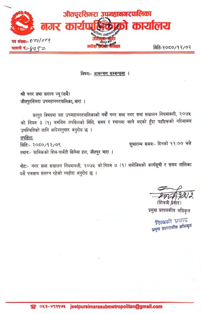 जीतपुरसिमरा उपमहानगरपालिकाको नवौ नगर सभा भोलि हुने
