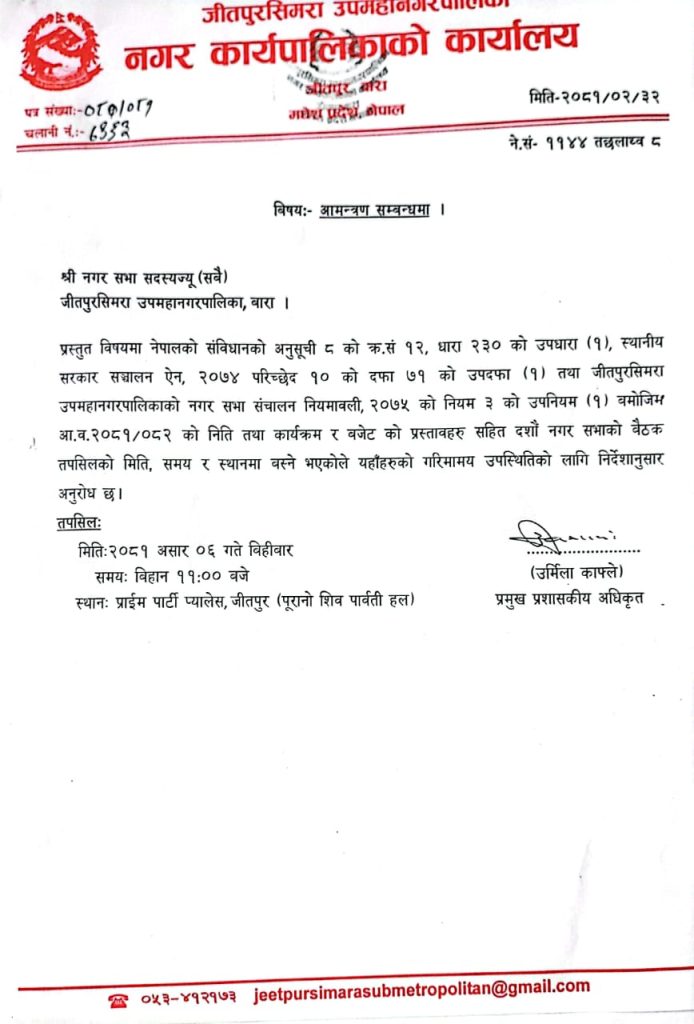 जीतपुरसिमरा उपमहानगरको १०औ नगरसभा असार ६ गते हुने