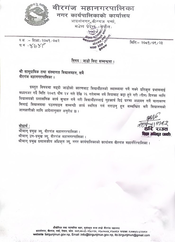 वीरगञ्ज महानगरपालिकाले चिसो बढ्दै गएकाले विद्यालयहरूलाई तीन दिनका लागि जाडो बिदा दिन निर्देशन दिएको छ ।