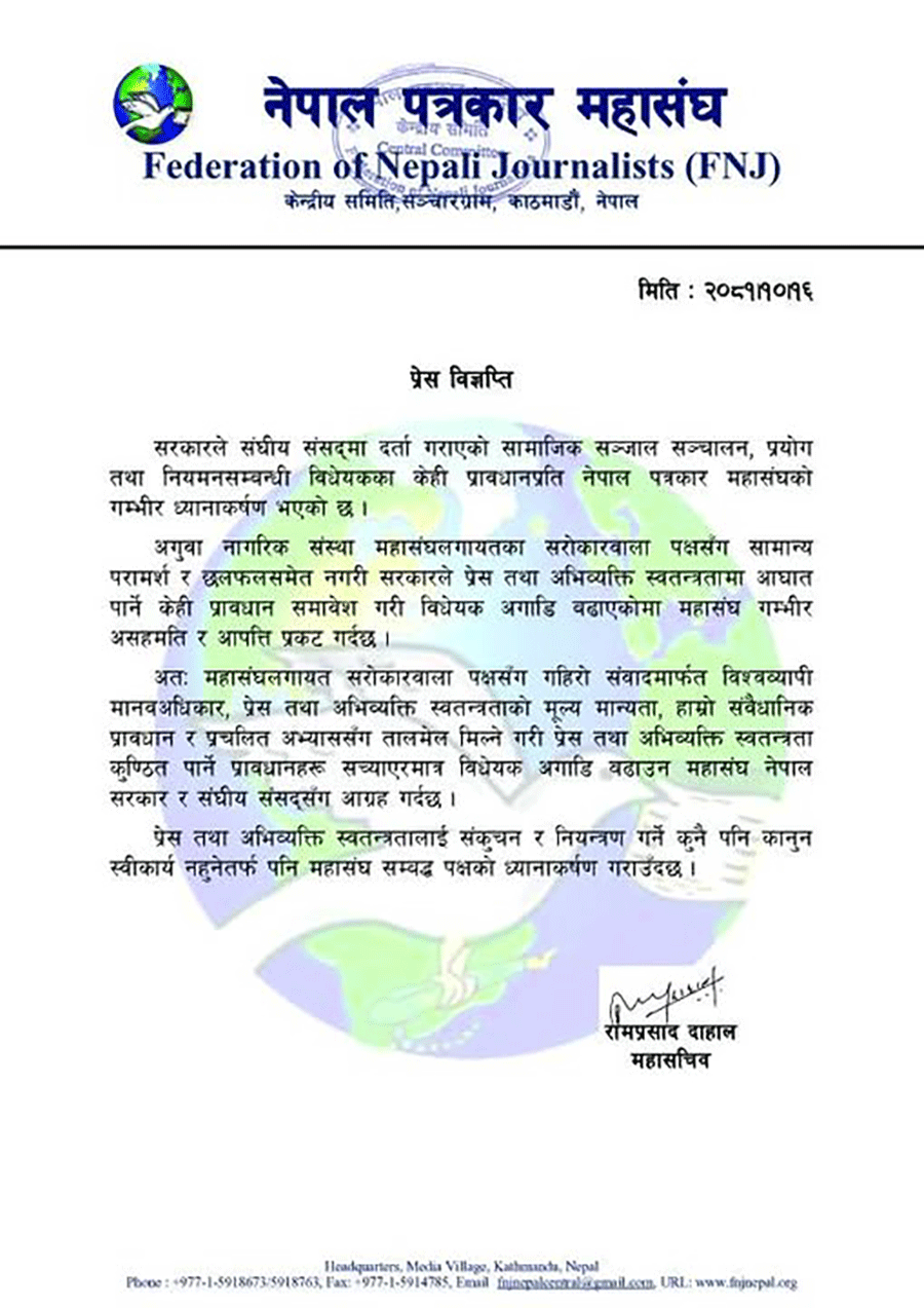 सामाजिक सञ्जाल विधेयकप्रति नेपाल पत्रकार महासंघको गम्भीर आपत्ति