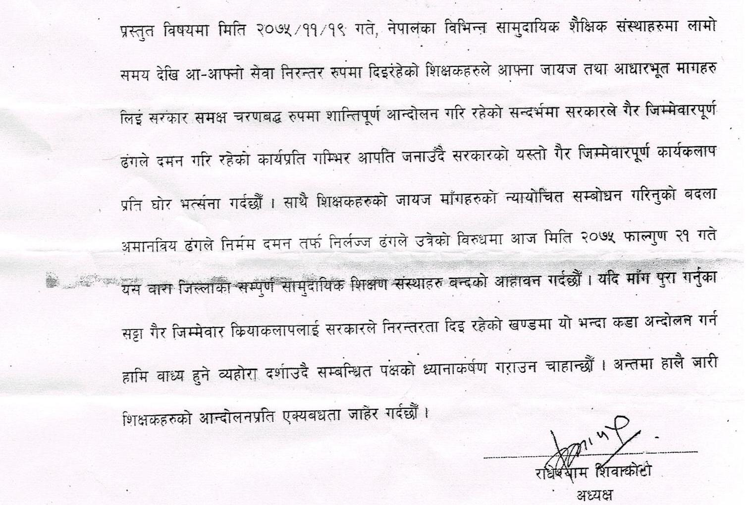 शिक्षक युनियन बाराले निकाल्यो बिज्ञप्ती, भन्यो ‘कडा कदम चाल्न नपरोस्’