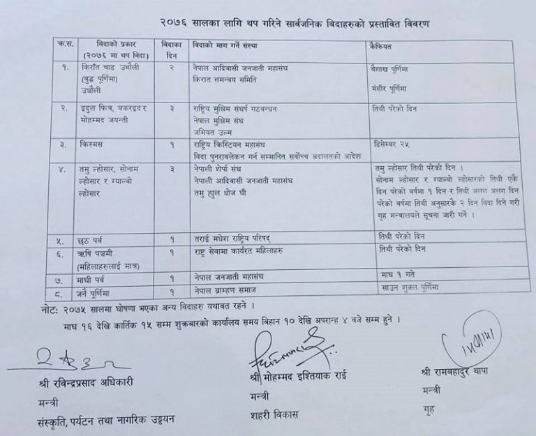 २०७६ को क्यालेण्डरमा १३ दिन सार्वजनिक बिदा थप्न प्रस्ताव